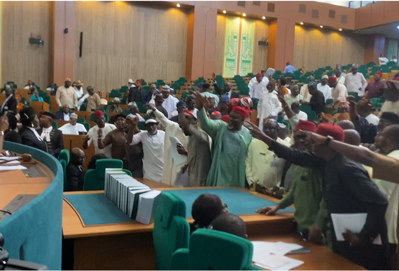 Some opposition members were heard shouting “Ole!” — a Yoruba term meaning “thieves” — apparently directed at members of the ruling All Progressives Congress (APC).